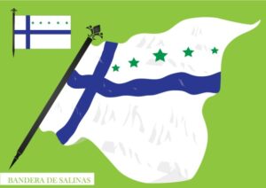 Compuesta por los colores azul, verde y blanco. Las cinco estrellas representan las zonas que conforman la Parroquia Salinas.